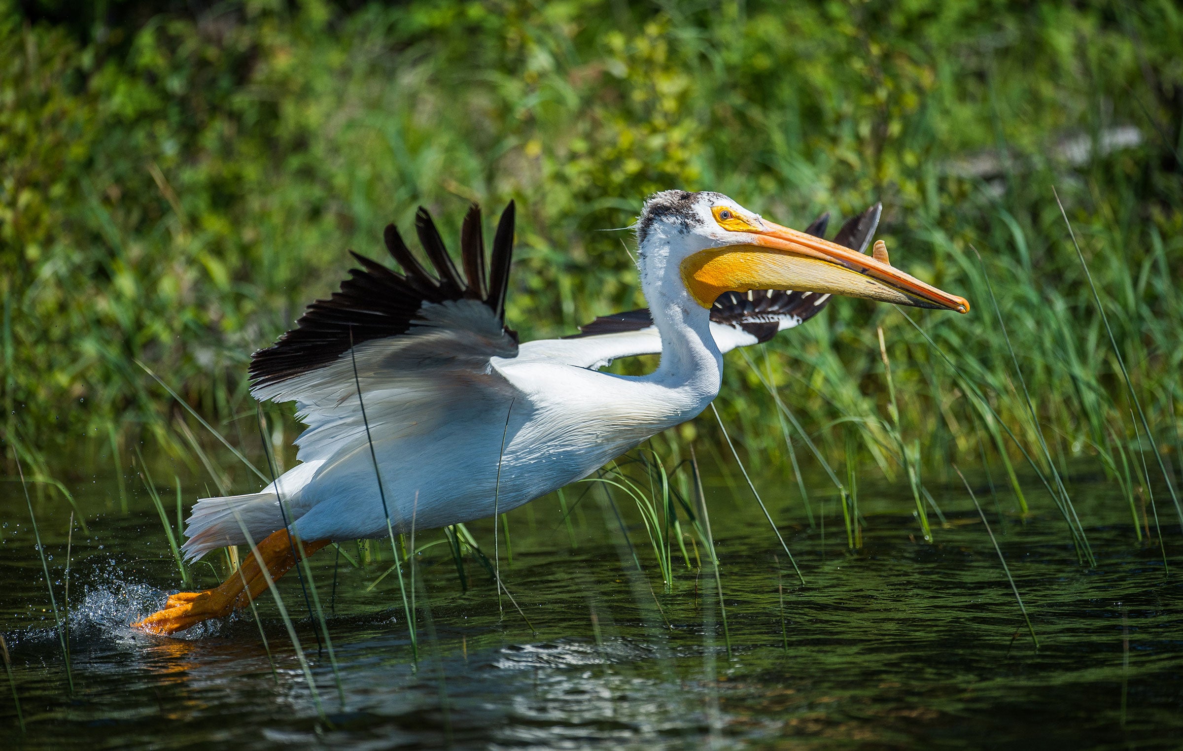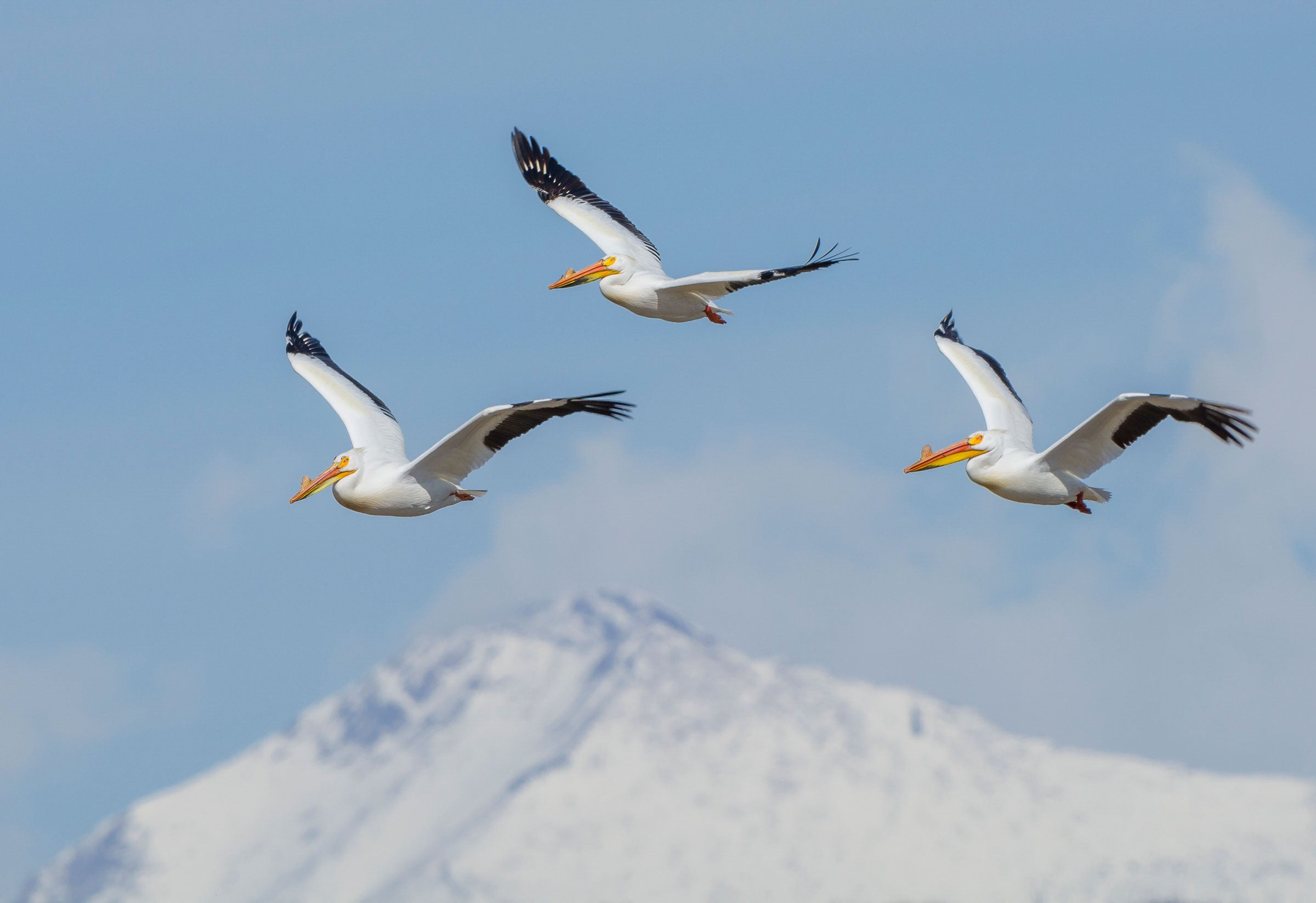 Es una de las aves más grandes de América del Norte, con una envergadura de 2,7 metros. Los PelÃcano Blanco Americanos son similar al pelÃcano pardo en su forma, aunque de mayor tamaño y hábitos distintos: se lo observa muy adentro en tierra firme, se alimenta de manera cooperativa en lagos de poca profundidad y no se zambulle en el agua desde el aire para capturar peces. A pesar de su gran tamaño, tiene un vuelo espectacular, y sus bandadas a menudo vuelan al unÃsono lentamente trazando cÃrculos a gran altura.