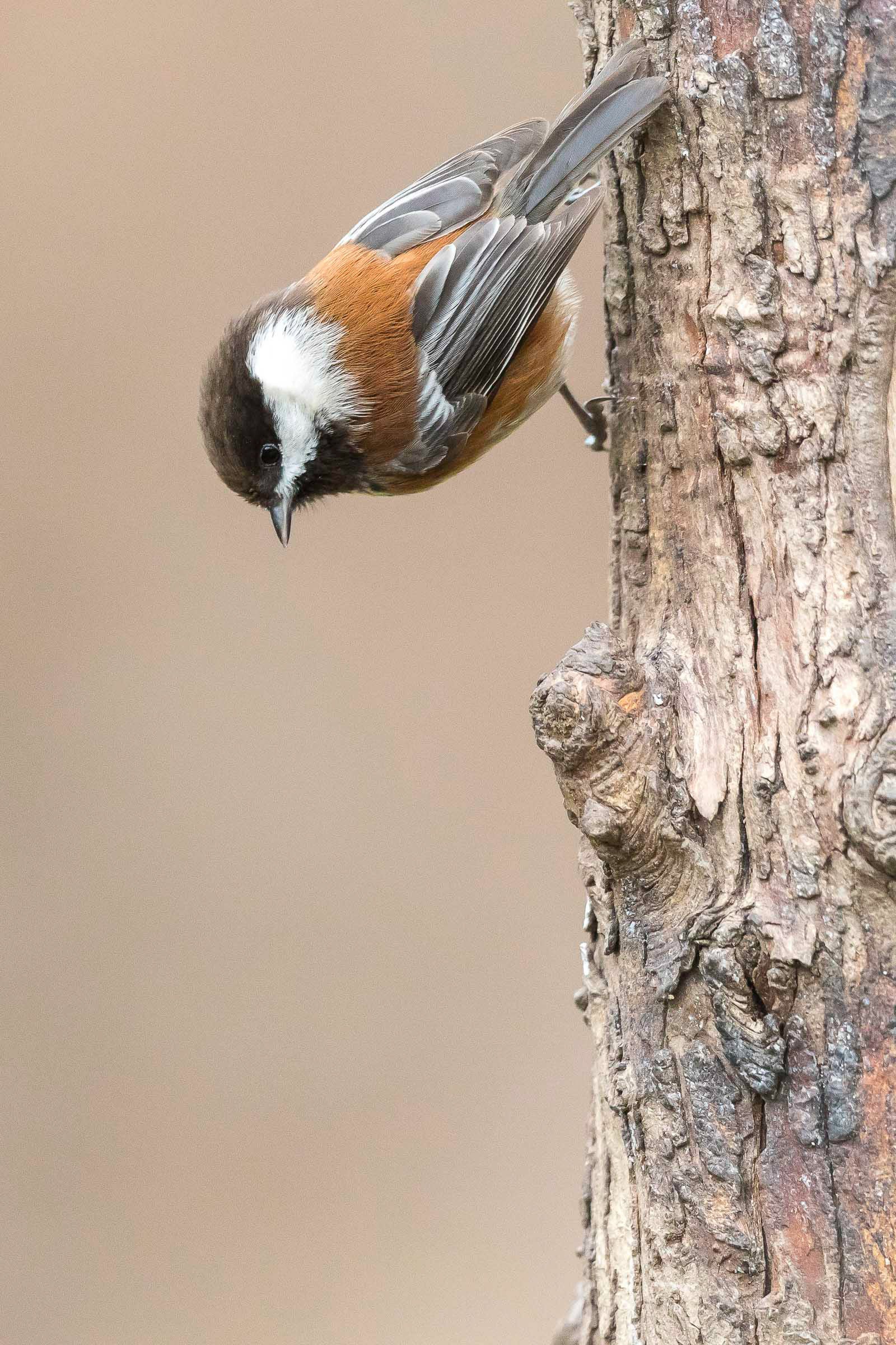 The most colorful of the chickadees, the Chestnut-backed is common in the Northwest. Inland, it may overlap in range with up to three other close relatives; but in the very humid coastal belt, in wet forests of hemlock and tamarack, this is the only chickadee present. In those surroundings its rich chestnut colors may be hard to see, but it can still be recognized by its husky, fast chick-a-dee calls.