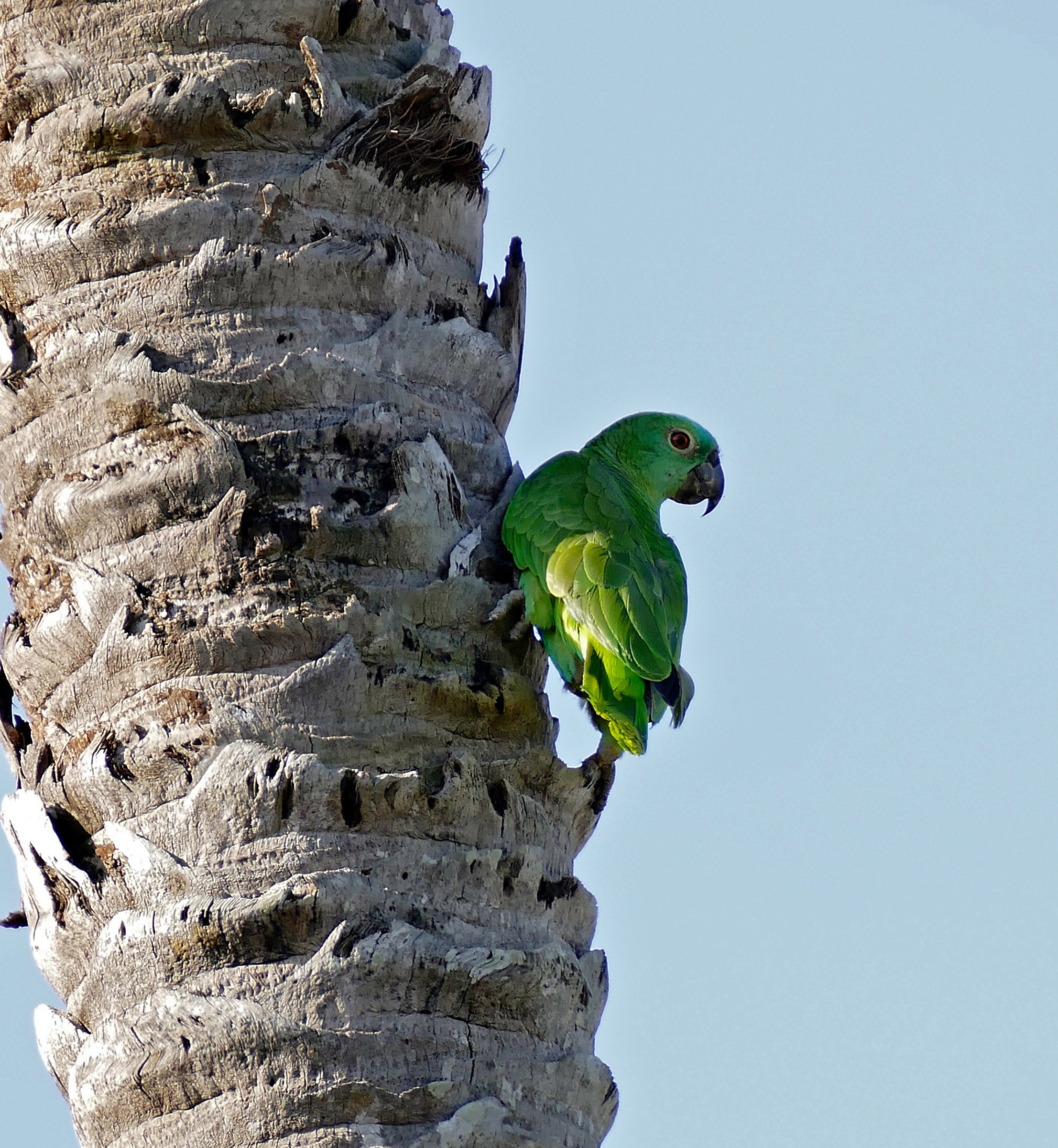 16" (41 cm). A very large, short-tailed parrot, green all over with few distinguishing marks. Whitish eye-ring is very conspicuous. Crown bluish to green. Like other Amazona parrots, has red patch in wing, noticeable in flight.