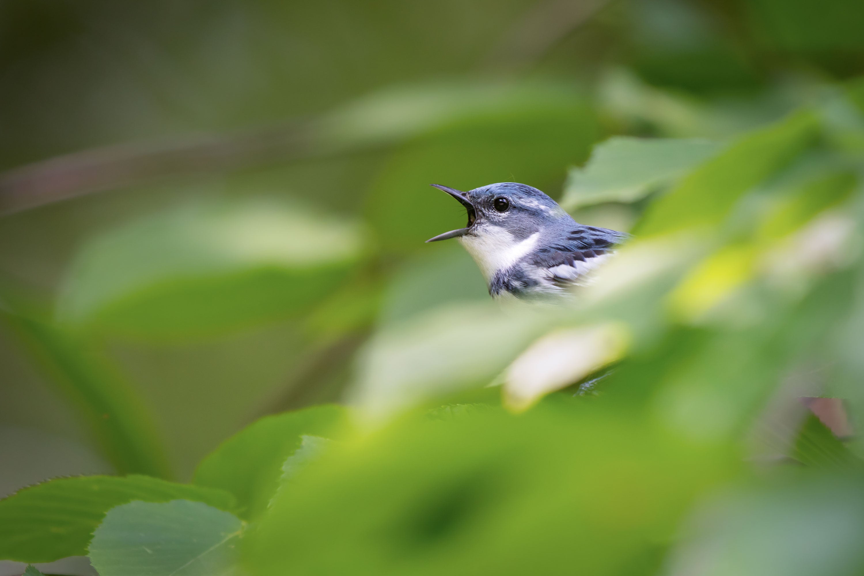 The sky-blue upperparts of the male Cerulean Warbler are difficult to observe in summer: At that season, the birds stay high in the tops of leafy trees in the eastern United States and extreme southern Canada. The bird itself has become harder to observe in recent decades, as its numbers have decreased in parts of its range. Cowbirds, which lay their eggs in the warblers' nests, may be finding their unwitting 'hosts' more easily as forest patches become smaller.