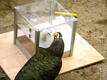 Researchers presented six kea and five crows with a fair and square challenge. An irresistible birdy treat was placed within a transparent cube for the birds to examine at their own leisure. Rather than just having one means of accessing the treat, each side of the box featured a different puzzle for attaining the goodies inside. The birds could chose between pulling a string tied around the treat, tugging a hook-shaped lever to open a window, inserting a marble into a slide that led towards the reward, or poking a stick-like tool into a hole to push the food out of the box. After a bird solved a certain side of the puzzle, that side was blocked off, forcing the animal to figure out a new way of earning the coveted snack.