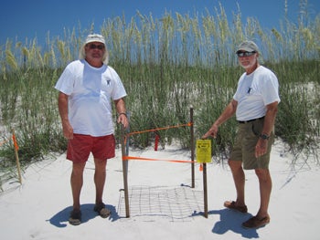 George Crews (left) and John Oliver stand beside a sea turtle nest in St. Joseph Peninsula State Park, Florida. They are members of Friends of St. Joseph Bay Preserves, a sea turtle protection group that regularly scouts the beach for nests and is now helping in the egg transfer. (Photo by Justin Nobel/探花精选 Magazine)