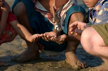 Kids releasing a Spoon-billed Sandpiper in Myanmar. Photo by Rob Robinson/BTO