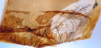 ![]() An isolated barb from a vaned feather, trapped within a tangled mass of spider鈥檚 web in Late Cretaceous Canadian amber. Pigment distribution within this feather fragment suggests that the barb may have been gray or black. Image: Science/AAAS |