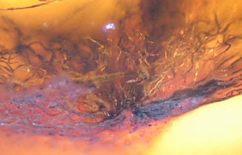 ![]() These filaments are morphologically similar to the protfeathers that have been found as compression fossils associated with some dinosaur skeletons. Pigment distributions within these filaments range from translucent to near-black. Image: Science/AAAS |