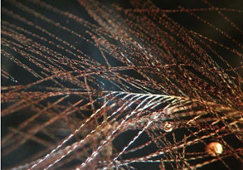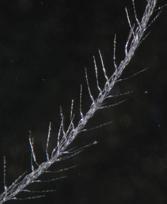 ![]() Six feather barbs. Localized pigmentation creates a beaded appearance within each barbule: This has implications for the structural interpretation of fossil feathers exhibiting this general morphology. Pigment distribution within the specimen suggests that the feather would have originally been medium- or dark-brown in color. Image: Science/AAAS |
